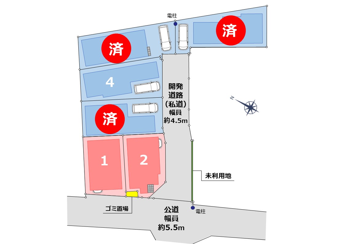 接道 | 南東側 私道 幅員4.5m(開発道路) 南西側 公道 幅員5.5m |
