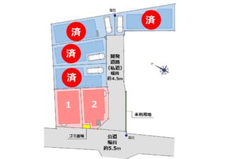 区画図・間取り図 【完成しました!】住環境充実です!1階水廻り集約しており対面キッチンや各居室に収納完備しております。元渕江公園へは徒歩4分! 開発により整備された道路のある新築戸建て分譲地誕生。私道はお子様が安心して歩…